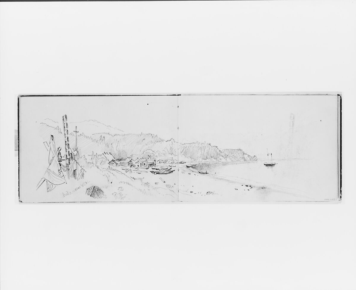This sketchbook contains fifty-one drawings in graphite and ink, primarily of Pacific Northwest landscape and marine subjects. The addition to the Museum’s collection of this and one other sketchbook (1992.2.1) of New England and Pennsylvania landscape and marine subjects by Richards virtually completes a representation of the range of the artist’s graphic achievement. The books are remarkable for both highly finished compositions and for pages of rapid notes probably taken during strolls through the countryside. The pages testify to Richard’s tireless pleasure in observing nature, to the sketchbooks utility as a rehearsal place for his hand, and to the vivid impressions he could produce with the simplest of means. Not least of all, they offer a key understanding to the artist’s uncanny facility in his better known paintings and watercolors.