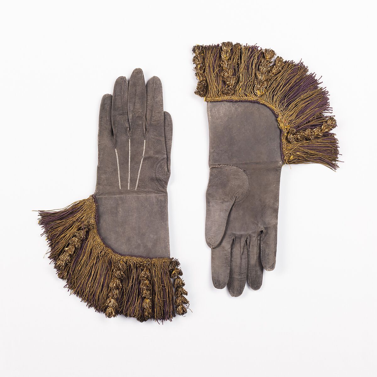 The extravagant fringe on these gauntlet gloves features purple silk, gold cord and gold tassels. The gloves were collected by Stewart Culin (1858-1929) during a collection expedition in 1920. Culin was the Brooklyn Museum's first Curator of Ethnology, serving from 1903 to 1929. Possessing an insatiable curiosity and appetite for collecting objects of all kinds, Culin conducted over twenty worldwide collecting expeditions between 1901 and 1928. The trips covered American Indian territories, New England, Asia, India, Great Britain, and all of Eastern and Western Europe. The seven expeditions between 1917 and 1928 were specifically focused on collecting regional textiles and costumes from Eastern and Western Europe and, to a lesser extent, New England. Culin's goals for these trips were not just to expand the Museum's holdings, but also to preserve their cultural contexts. He did so through amassing photographs, notebooks, and ephemera which documented the social, commercial, and cultural circumstances surrounding their acquisition. His collecting philosophy embraced both rare and high-quality pieces as well as those which represented daily life or were of particular social or historical interest.