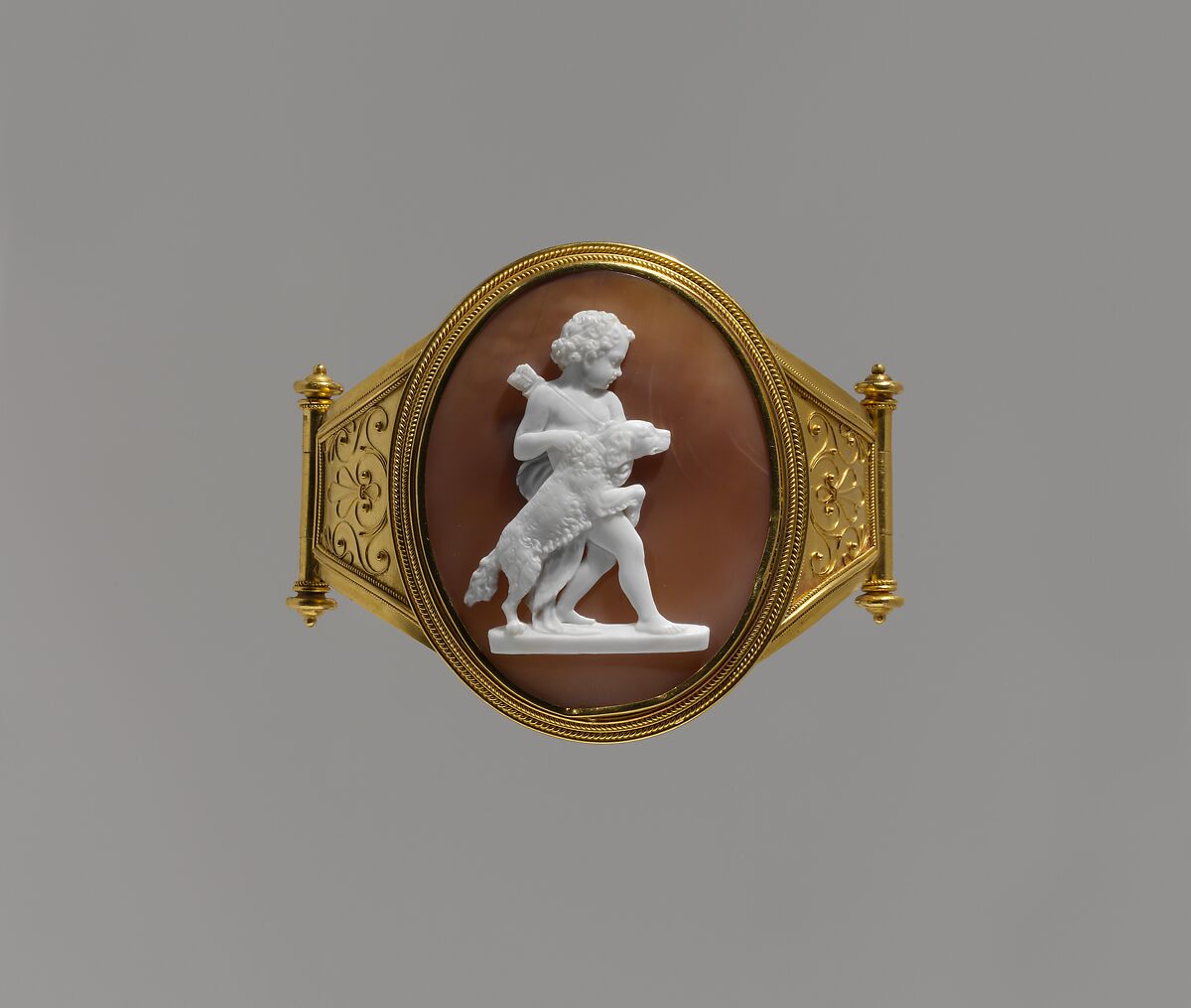 Luigi Saulini was a hardstone carver of great dexterity. He more frequently produced cameos of shell, for which he charged a tenth the price. Much of his output was based on statuary by his contemporaries. The model here was an as yet unidentified marble group in the round (indicated by the plinth at the bottom). The bracelet, together with another displaying a micromosaic circlet of Italian peasant girls, was bequeathed by a colorful Irishwoman, Maria Morgan, whose knowledge of horses led King Victor Emmanuel of Italy to entrust her with his stables. According to her, the bracelets were the king’s parting gift before she left for the United States, where she became a newspaper reporter on equine matters, eventually retiring to Staten Island.