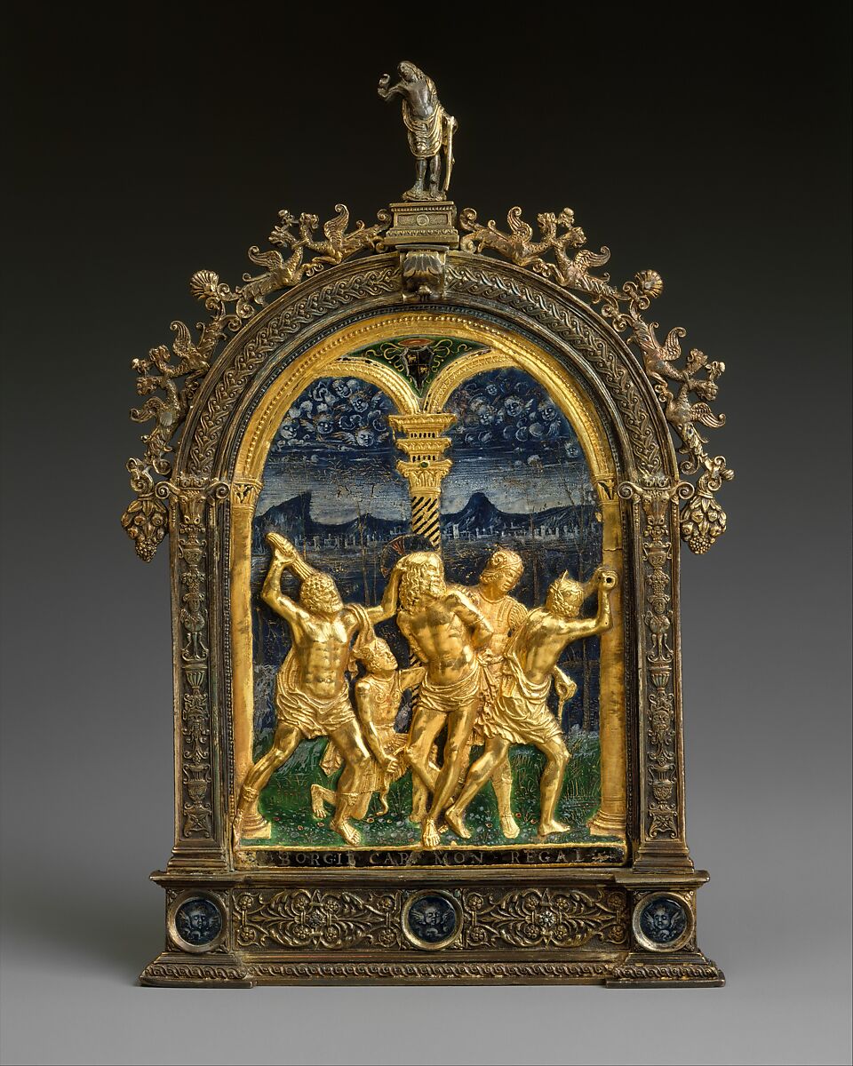 The inscription at the base of the relief refers to Giovanni Borgia (1446-1503), bishop of Monreale, who was created cardinal in 1492 by his uncle Pope Alexander VI, and the identification is confirmed by the coat of arms painted on the spandrel between the two arches. The high quality of the goldsmith's work has led this pax to be attributed to Caradosso Foppa (ca.1452-ca. 1526). The finial figure and the enameled roundels on the base are later additions.