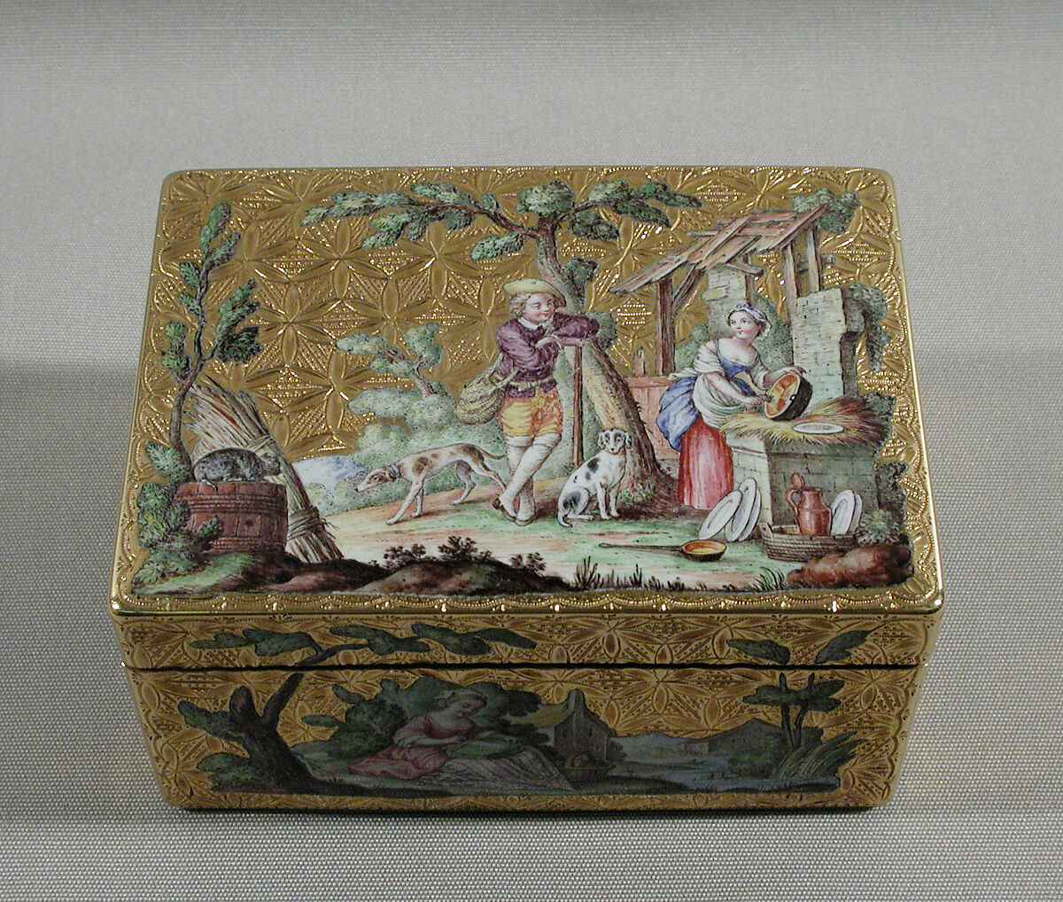 In eighteenth-century Europe, Paris led the production of high-quality luxury goods. Parisian goldsmiths made a wide range of small, personal articles such as snuffboxes; étuis to hold sealing wax, tweezers, or utensils for sewing; souvenirs, which contained thin ivory tablets for note taking; and shuttles for knotting lace. Gold snuffboxes and boxes decorated with portrait miniatures were prized and frequently given as royal gifts, often to ambassadors or members of the court in lieu of cash payments for their services. Coveted and admired, these boxes were produced from a variety of materials. The best were skillfully made of gold and embellished with diamonds, enameled decoration, lacquer, and other luxurious materials. By the middle of the century, the taking of snuff had become an entrenched social ritual, and the snuffbox, too, had become an important social prop. Snuffboxes were considered highly fashionable accessories, with some merchants advertising new boxes with each change of season. The popularity of snuffboxes extended to all levels of society, and for those who could not afford gold, boxes were produced in less expensive materials such as silver, tortoiseshell, porcelain, or domestically produced lacquer.