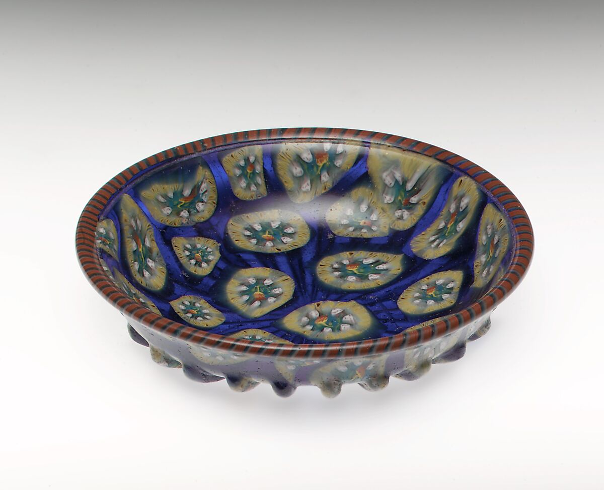 This ribbed bowl was made by fusing cross-sections of glass cane (murrine) into a sheet and forming it with a mold, a revived ancient technique called mosaic glass. Seven tiny faces surround a tulip-like flower at the center of each of the twenty-nine murrine.