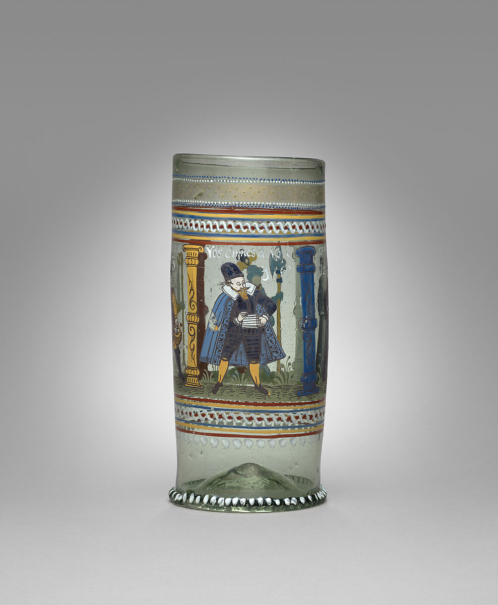 The enamel decoration on this beaker features four figures representing different social classes. Above each figure is a Latin inscription describing their role: priests pray, noblemen and knights fight, peasants labor, and merchants “devour all.” The antimerchant sentiment suggests that this work was made for the nobility, rather than a middle-class burgher market, and was likely used in one of the many drinking rituals central to social life in the 1600s.
