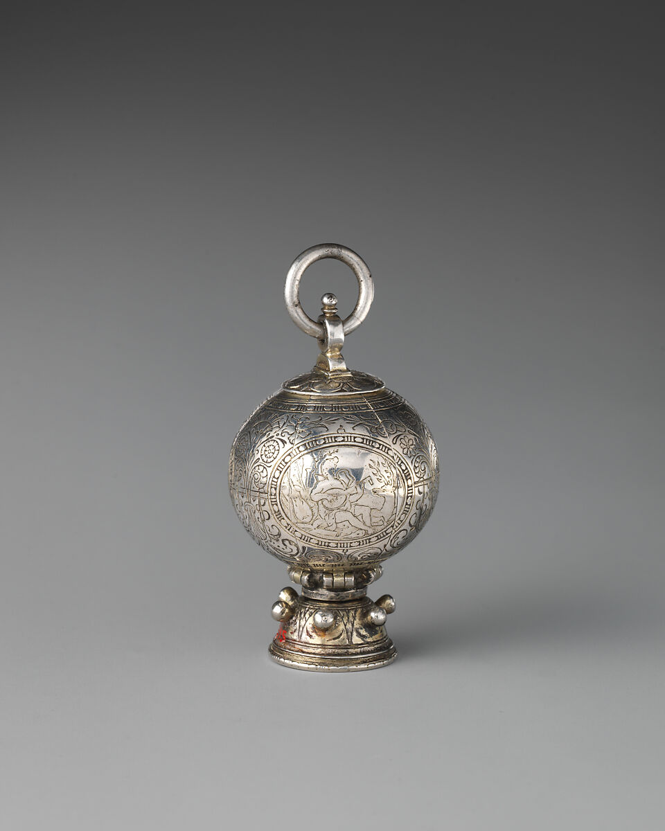 Functional jewelry, pomanders were filled with strongly scented aromatics used to ward off disease and sanitize the air. Each remedy was enclosed in a hinged hollow segment with a sliding lid, held in place at the top by a screwcap with a loop for a chain or cord. The segments are labeled for their contents: cinnamon, nutmeg, rosemary, clove, amber, and schlag (short for schlagwasser, a mixture of brandy and flower petals).