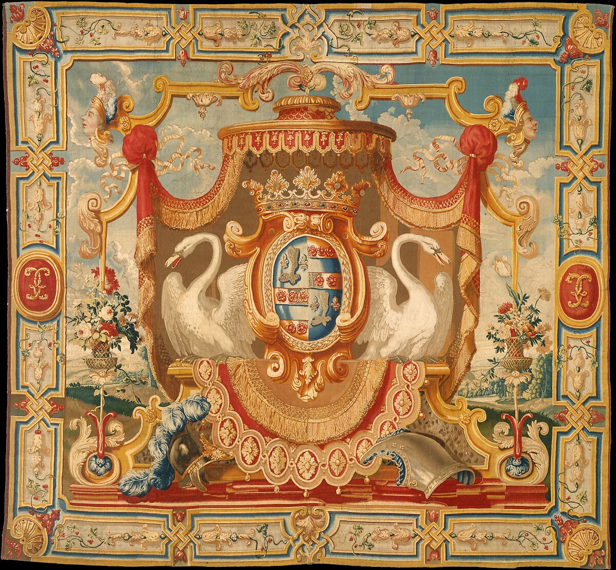 This armorial tapestry celebrates the Greder family of Solothurn (Switzerland), many of whom served in the French army. It was probably commissioned by François Laurent Greder (1658–1716) between 1691, when he became a brigadier and 1694, when he was made a knight of the Order of Saint Louis. The dramatic use of the swans to flank the armorial is an allusion to the swan feet that form part of the Greder arms.