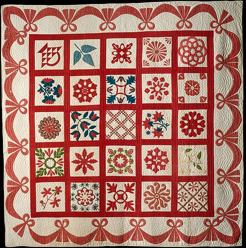 In the mid-nineteenth century, at the time this outstanding quilt was made in Carmel, New York, a town about fifty miles north of New York City, the florid and intricate Rococo Revival Style was in full bloom. The grapevines and appliquéd flowers entwined into wreaths stiched onto the surface are reminiscent of the decoration found carved into the rich rosewood backs of high-style New York furniture of the same era. While many bed quilts are quite modest objects meant for everyday use, this one would have been considered stylish and sophisticated when it was created. Its exceptionally good condition reinforces the notion that it was meant to be a "best" quilt, taken out only on special occasions to beautify its maker's home.