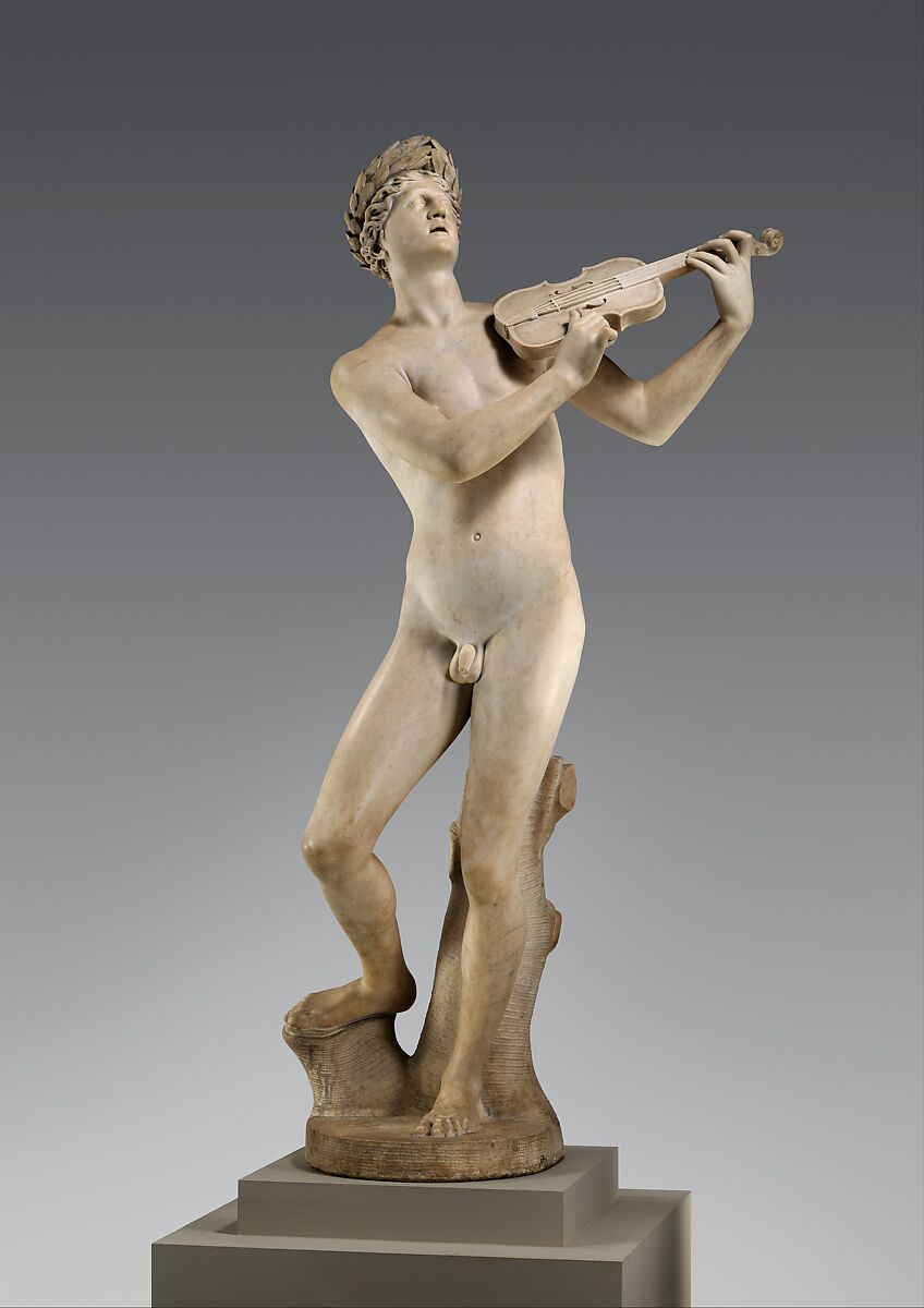Orpheus, famous for taming beasts with his music, is here shown entertaining himself, his body swaying to the sound of the lira da braccio. The statue was carved for the Palazzo Corsi, Florence.