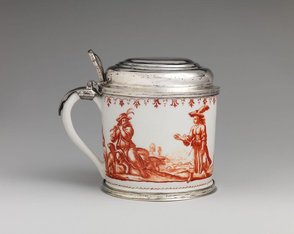 Monochrome decoration ornamented Du Paquier porcelain from the beginning; indeed, it is one of the manufactory’s defining characteristics. It is found in several colors, including a lovely iron red. The name of the artist who painted this tankard is not known; his hand is found, however, on a number of other early pieces made at Du Paquier as well as on a Chinese bowl in the Museum of Decorative Arts, Prague, so it is likely that he both was employed within the factory and performed freelance, or Hausmaler, work.