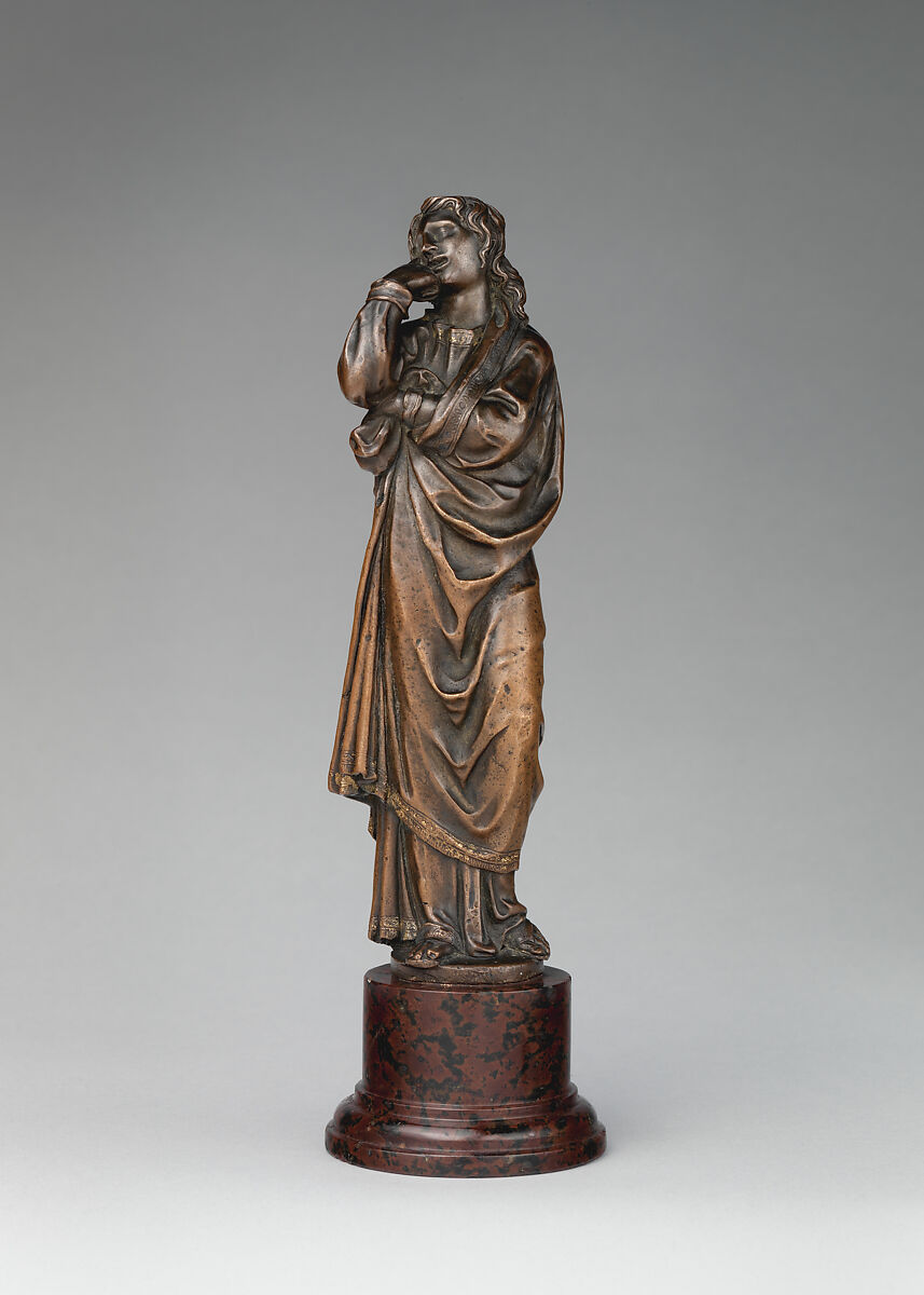 Despite exhibiting different styles and factures, the likenesses of Saint John, one of which is paired with an image of the Virgin Mary, warrant discussion together, for they offer a rare opportunity to examine early Renaissance casts of the same composition. All three bronzes, acquired a few years apart, reflect the Late Gothic compositional habits of the fifteenth-century Sienese school of sculpture that began with Jacopo della Quercia and continued through Vecchietta and Neroccio di Bartolommeo de’ Landi. The hallmarks of the school are firm, oblong silhouettes often enclosing quite agitated draperies and fervent facial expressions.
