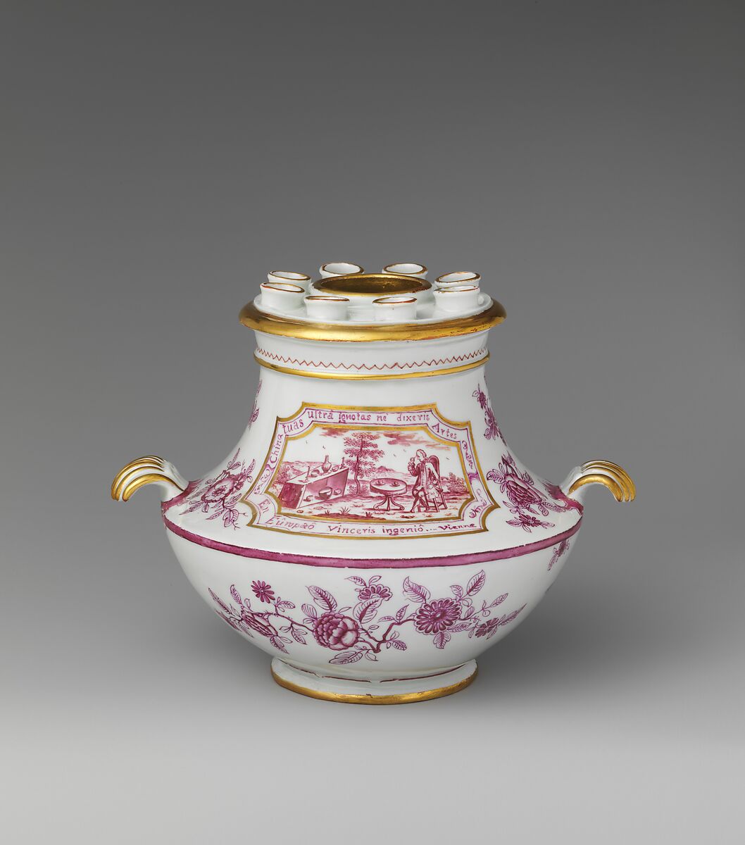 This is one of four surviving vases from the most important garniture made by Du Paquier. All have cartouches surrounded by inscriptions that relate to the manufactory. This example is of particular interest as it appears to show Claudius Innocentius du Paquier, seated at a table, contemplating a selection of his porcelain. The Latin inscription translates, “No longer, China, shalt thou say thy arts are unknown / Behold thou shalt be conquered by the European spirit . . . Vienna.”