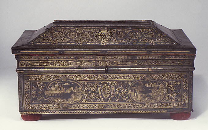 - Medium: Wood, overlaid with iron plaques damascened with gold and silver