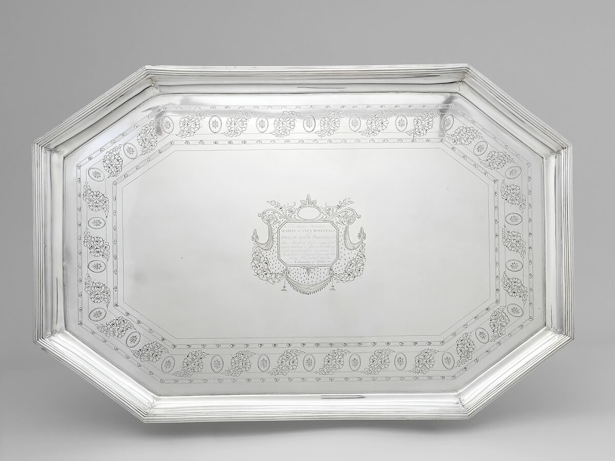 The yellow fever epidemics of 1793 and 1798 devastated the city of Philadelphia, killing thousands and forcing many to flee what was then the nation’s capital and largest city. Among those who remained behind to tend the stricken was Dr. Philip Syng Physick, “the father of American surgery.” For his exceptional dedication and self-sacrifice, the board of managers of the City Hospital presented him with these two magnificent pieces of silver—a tea tray and a hot-water urn—fashioned in the Neoclassical style, with bright-cut paterae and floral festoons. Each piece is engraved with the dedicatory inscription “From the Board of Managers of the Marine & City Hospitals to Philip Syng Physick, M.D., this Mark of their respectful approbation of his voluntary and inestimable services as Resident Physician at the City Hospital in the Calamity of 1798.”