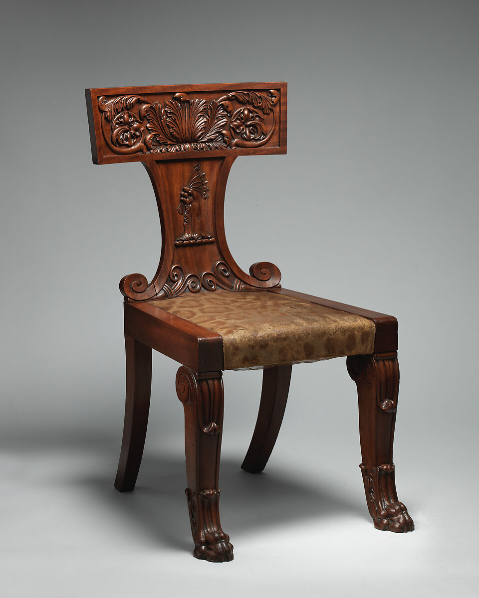 The klismos, with splayed legs and round back, was an antique form resuscitated in the archaeological enthusiasm of the late eighteenth century. The signature "C. Dixwell 1820" beneath the seat rail of the side chair (see 67.63.1) is that of Charles Dixwell, a London "upholder," a profession including the tasks of upholsterer, furniture repairman, and undertaker.