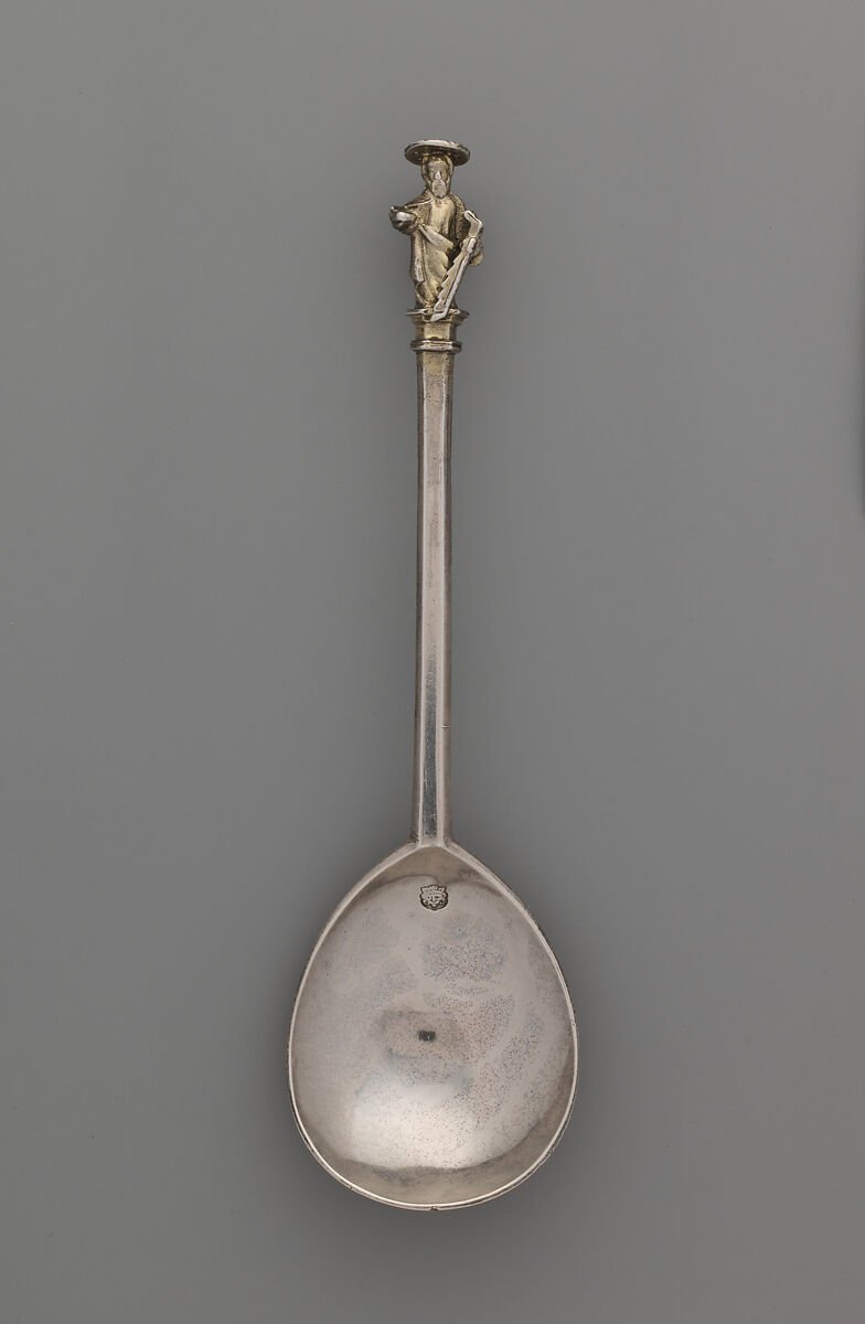 The set (67.166.1–.13) includes a master spoon with a figure of Christ and twelve apostle spoons. Martin Hewitt who made the Saint Andrew spoon had served his apprenticeship under William Cawdell. Both were specialist spoonmakers.