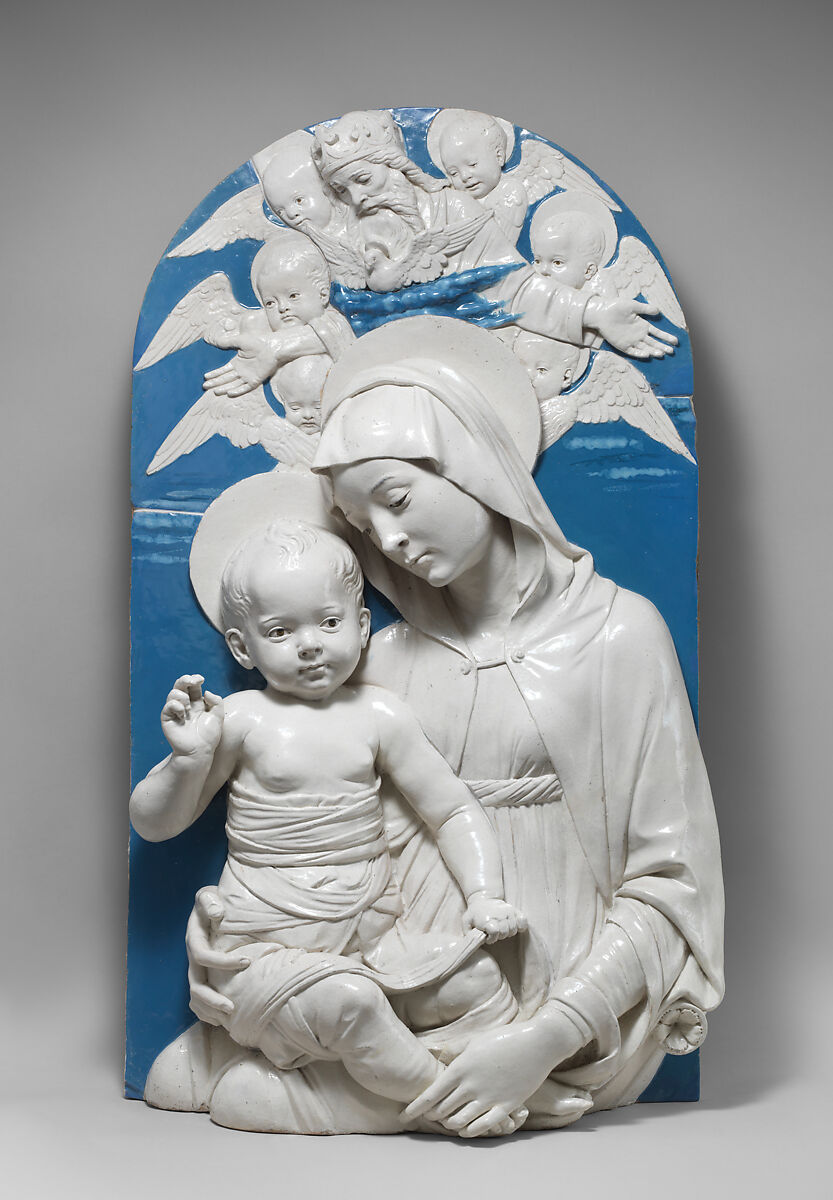 Andrea della Robbia was the nephew and disciple of Luca della Robbia, who developed the brilliant blue and white glazed terracotta sculptures that are identified with the Renaissance in Florence. Among Andrea’s earliest iconic creations, this work shows the Virgin Mary tenderly supporting the Christ Child, who solemnly raises his hand in blessing. Modeled in high relief with palpable naturalism, the lifesize figures seem to share our physical space while God the Father and a host of angels look on from heaven.