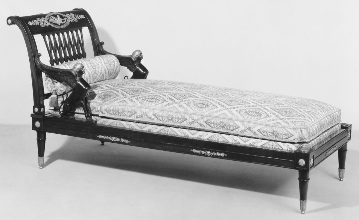 The sphinx-shaped arms suggest a date soon after Napoleon’s Egyptian campaign which is confirmed by the stamp of JACOB FRERES/R. MESLEE used by the Jacob firm only between 1795 and 1803. The daybed must have supported several Bonapartes, for it bears the inventory mark of the Château de Neuilly, where two of Napoleon’s sisters lived, first Caroline Murat and later Pauline Borghese, as well as marks for the Château de Trianon, the Palais des Tuileries, and the Château de Villeneuve l’Etang.