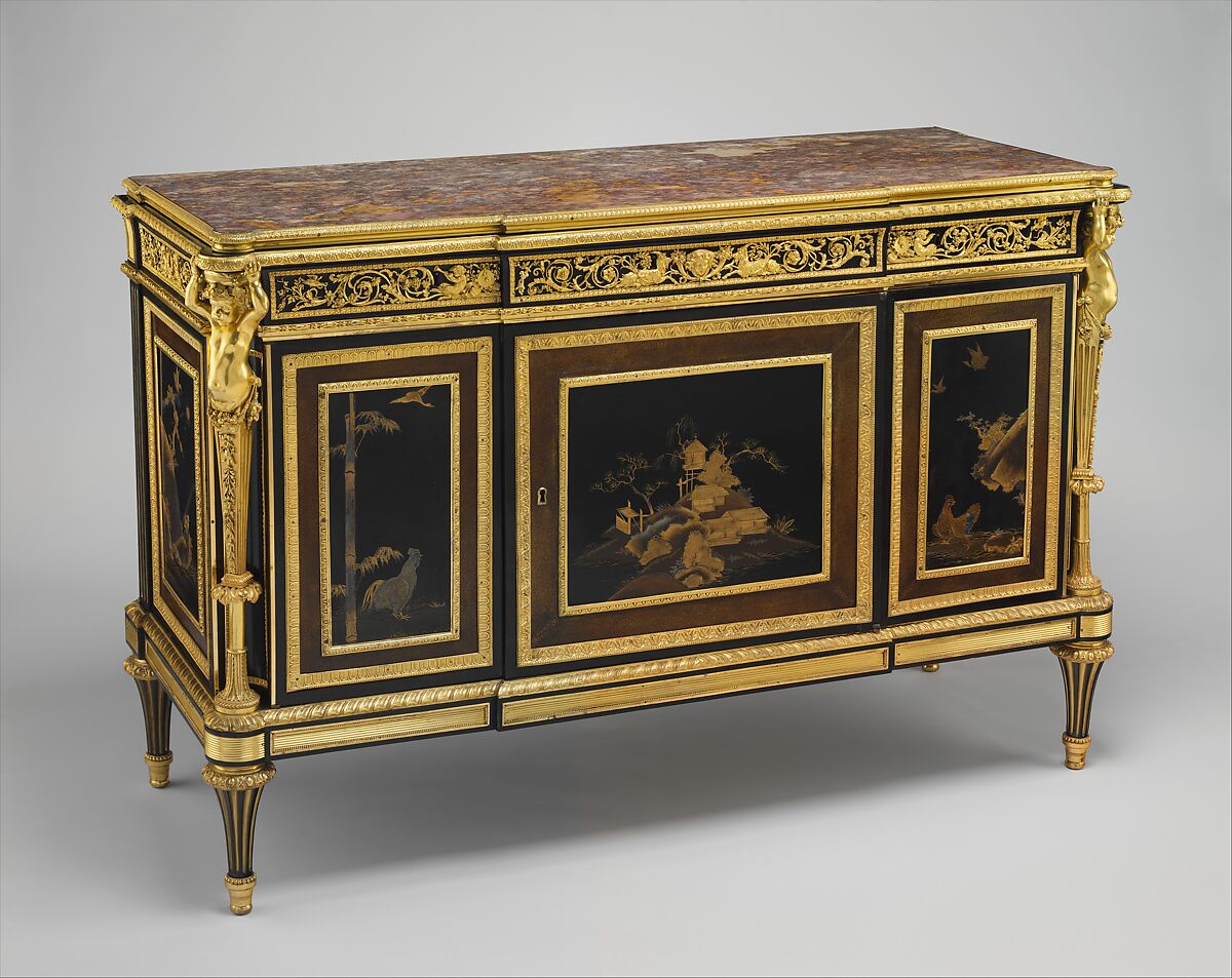 The lacquer furniture was the work of Adam Weisweiler, who stamped the back of the secretary. He worked almost exclusively for marchands-merciers and especially for Dominique Daguerre, who supplied Weisweiler’s Neoclassical furniture to an international clientele. The drawers of the breakfront commode, known as a commode à vantaux during the eighteenth century, are enclosed behind a double-hinged and bolted folding door to the right, and a single door to the left. The sculptural half-figure corner mounts and those of the frieze, which include scrolling acanthus and ivy leaves, goats, and playful infant fauns, add a nearly unrivaled richness to this set of furniture. Because of their outstanding quality they have in the past been attributed to the bronze worker Pierre Gouthière (1732–1813). They might, however, equally well have been the work of François Rémond, who is known to have cast, finished, and gilded similar bronzes for Daguerre.