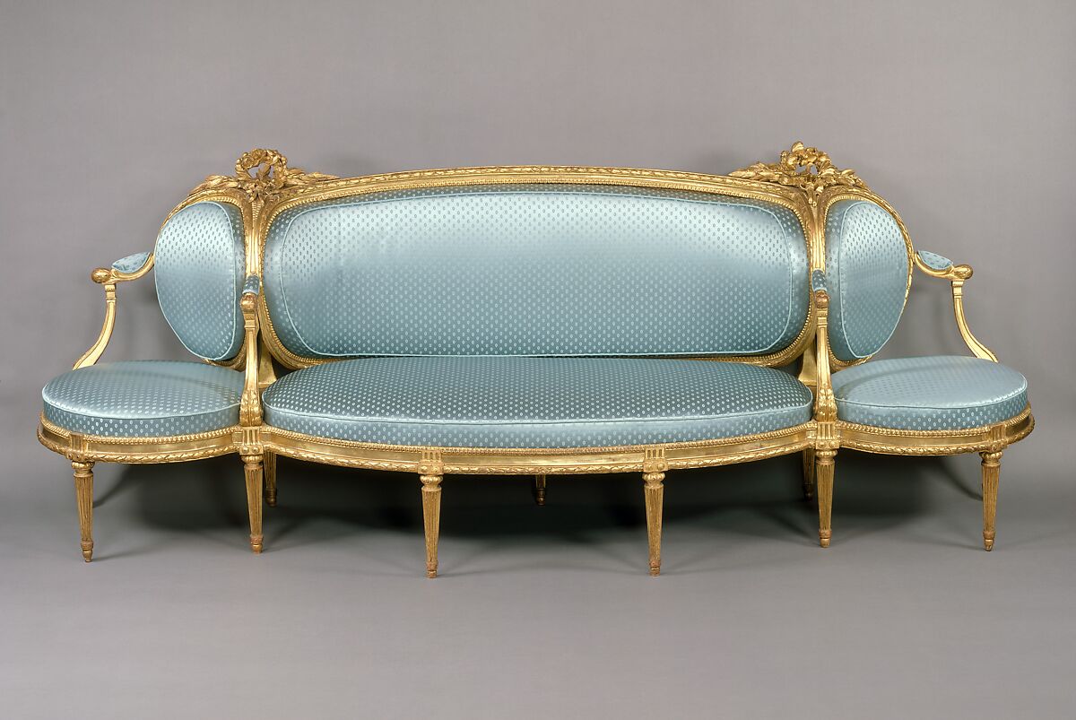 A sofa of this type, with a wide central section and a single outward-facing seat at each end, was called a canapé à confidents, although a design less likely to encourage exchange of confidences would be hard to imagine. Examples were made primarily in the Louis XV and Louis XVI periods, and only a small number survive. However impractical, the form was highly decorative, and it appears in designs for neoclassical wall elevations where the shape and carving are conceived in harmony with the wall paneling.[1] On the present piece, the carving on the wreaths of roses and olive branches tied by a ribbon at the top of each end is particularly skillful. This canapé has been described by both the comte de Salverte and Guillaume Janneau as Sené's finest known piece of furniture in the Louis XVI style.