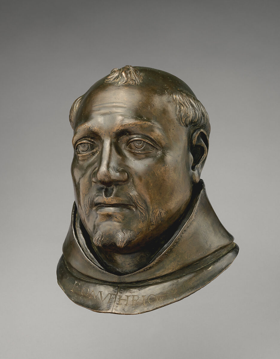 The subject, identified by the inscription beneath his cowl, was presumably the theologian Hieronymus Onuphrius who wrote De Paenitentia virtute (Venice, 1616) and Aureae disputationes de anima (Venice, 1619). The head was probably in a niche, affixed by the iron strap protruding from the back.