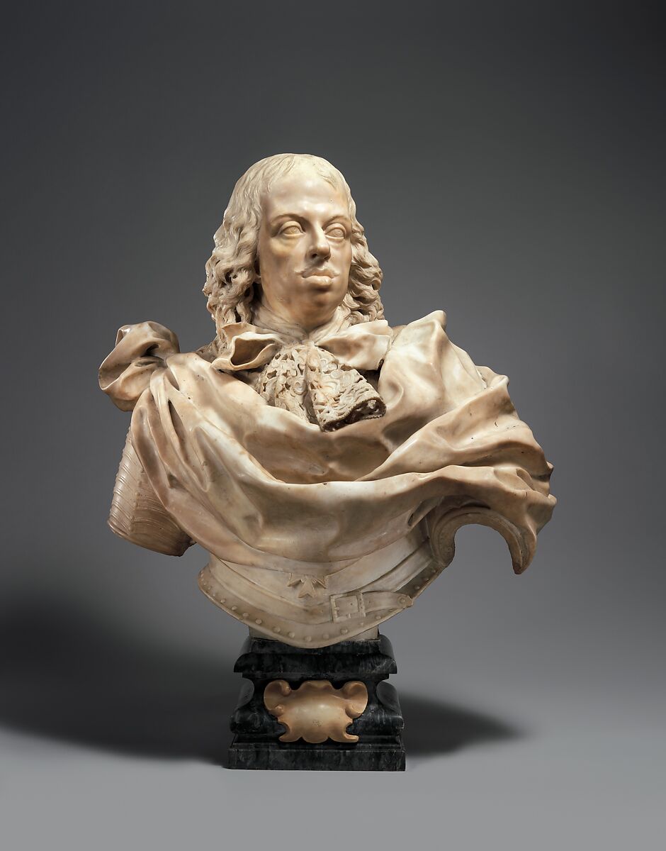 These meltingly carved busts of father and son (see also 1993.332.2) are surely the finest examples of the portrait style of G. B. Foggini, the leading sculptor of the Florentine Baroque. While strong echoes of Bernini date the creation of the pair to shortly after the younger artist's return from Rome, they already exhibit Foggini's talent for the depiction of material opulence that earned him the post of Medici court sculptor. Dynamic contrasts abound: the fragile lace cravats and lavish mantles (emulating modes of the contemporary French court) set off the realistically depicted faces. They in turn provide their own study in contrasts: the commanding pose and classic Habsburg physiognomy of the balding father serve as counterpoint to the sweet, somewhat unformed face of the youth, overwhelmed by a delirious cascade of curls. Foggini's artistic genius inaugurated the final flourish of Medici patronage. These busts, modeled from life, were followed by a series portraying other family members, all intended to promote the political aspirations of the fading dynasty. Their acquisition served to link our major series of Roman Baroque portrait busts to a growing collection of stunning small-scale Florentine sculptures of that period.