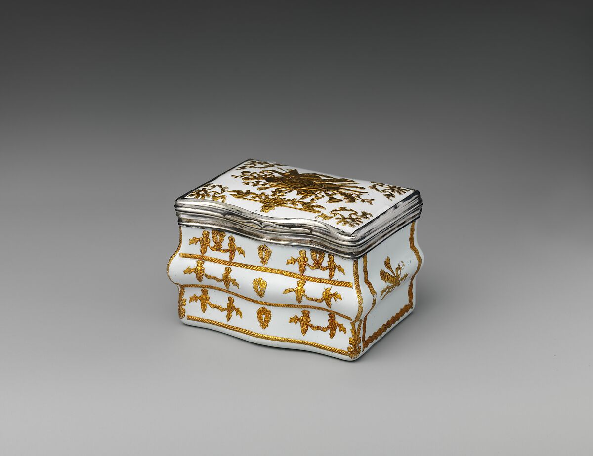 This charming snuffbox may have been created in the Berlin workshop of the Huguenot goldsmith Pierre Fromery (1685–1738), which was known for its enameled boxes.