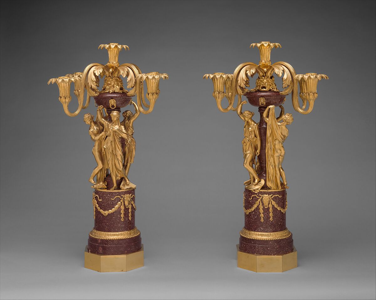 After the death of his father in 1763, Prince Marcantonio Borghese (1730–1800) inherited a great fortune that included the finest private art collection in the Eternal City.[1] His subsequent role as one of the most important collector-patrons of the Neoclassical period –rivaling, in his own family, Cardinal Scipione Borghese (1576–1633) in the Early Baroque era – has not received the attention that it deserves.[2] The creator of this pair of candelabra, Luigi Valadier (1726–1785), became the principal goldsmith for Prince Marcantonio, who was close to him in age, thus extending the ties that the artisan's father, the goldsmith Andrea Valadier (d. 1757), had established to the Borghese court decades earlier.[3]