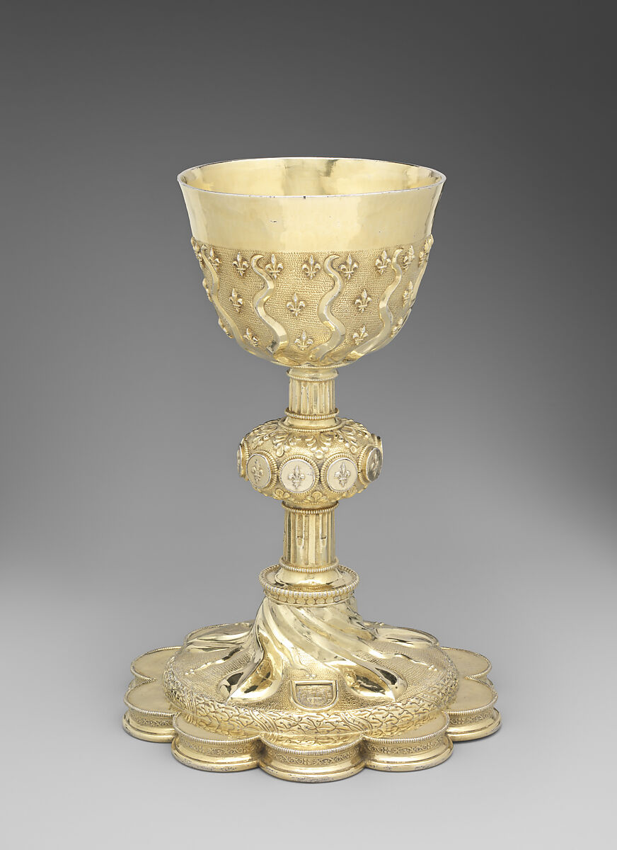 This chalice, made in the early French Renaissance, is decorated with motifs that derived from the late medieval period: wavy sun rays on the bowl and dome of the foot, which evoke the meditation on the Sacred Monogram as preached by Saint Bernardin of Siena (d. 1444). These lively features are joined by others taken from the more static repertoire of classical ornament derived from Roman architecture: a stem formed as a fluted column, the flutes alternately channeled; beading at the junction of stem and foot; acanthus on the upper and lower poles of the knop; and a wreath encircling the step of the foot. Fleurs-de-lis, emblems of the French crown, are found here as also on other French liturgical objects of the sixteenth century and may refer to the control over the church in France won by Francis I from Pope Leo X by the Concordat of Bologna in 1515. A shield-shaped frame on the foot encloses an insert engraved with the arms, episcopal hat, and angelic supporters of Bishop Fabio Mirto Frangipani. He was papal nuncio to the court of Charles IX from 1568 to 1572 and again in 1586. This plaque replaces an earlier insert, which may have been engraved with the arms of the previous owner.