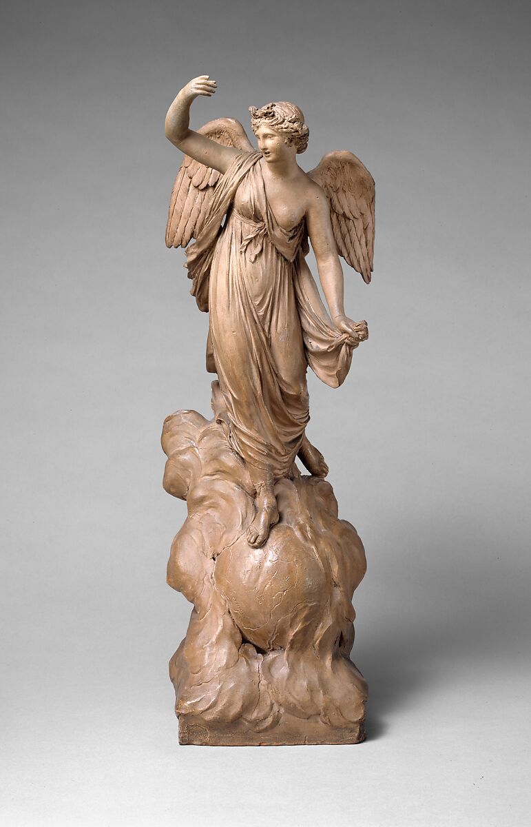 The Paris-trained Godecharle became the most important Neoclassical sculptor of Belgium. This enchanting statuette served as the model for a relatively stolid marble statue that stands in a niche in the royal palace of Laeken. Ordered at a time when the emperor Napoleon I included Laeken among his possessions, the figure is to be understood in the self-congratulatory context of French victories, interpreted as bringing peace to the world, or at least that part of the world upon which this winged Victory alights—the orb is inscribed with the names of countries of the Mediterranean, including Portugal and Spain, where Napoleon's vast designs by this time had in fact been stymied. Our terracotta girl formerly grasped an olive branch of peace along with the drapery in her lowered hand, while the upraised hand once brandished a trumpet.