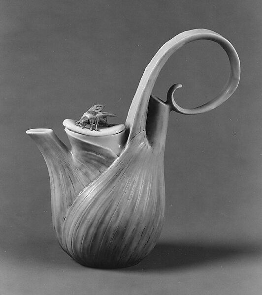 This coffee service (1988.287.1–.7) embodies the Art Nouveau style in ceramics. The designer chose the fennel plant to literally encase the functional wares, thereby integrating their utilitarian aspects with Art Nouveau's embrace of naturalistic forms. The gray-green enamel of the "fennel" portions was applied to unglazed porcelain, producing a matte texture similar to that of the plant itself, in contrast to the glossy, glazed white areas above.