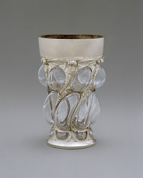 Joé-Descomps, a contemporary of the jeweler Rene Lalique, was a versatile designer whose work encompassed jewelry, vases of patinated or gilded bronze, and- his specialty- cups of mixed media in which the metal form was studded with cabochons of hardstones or glass. In this Art Nouveau evocation of German Renaissance glass he has driven his personal style to a dramatic conclusion.