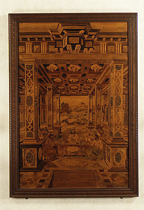 The inlaid panels show architectural views, still lifes, landscapes, sacred subjects and ornamental patterns.
