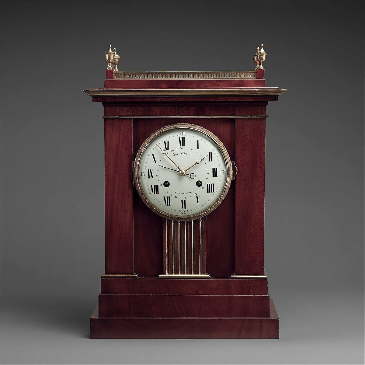 Its severe architectural form makes the case of this clock as imposing a classical monument. Typical is the use of finely grained mahogany veneered, applied from a single sheet from the frieze at the top down to the base, combined with brass inlay and gilt-bronze mounts. The base, enamel dial with bold roman numerals, and steel hand that indicates the day of the month make it an ideal timepiece for a desktop. Displayed on the rolltop desk with Chinoiserie, its simplicity looks like an anachronism. It is, however, a perfect match when the rolltop is lifted (see ill.). The movement is attributed to Élie Prudhomme, a Moravian clockmaker in Neuwied. The dial is signed Jean Thomas/Petersbourg. Thomas, a Swiss clock maker who lived in Saint Petersburg in the early nineteenth century, may have repaired the movement.