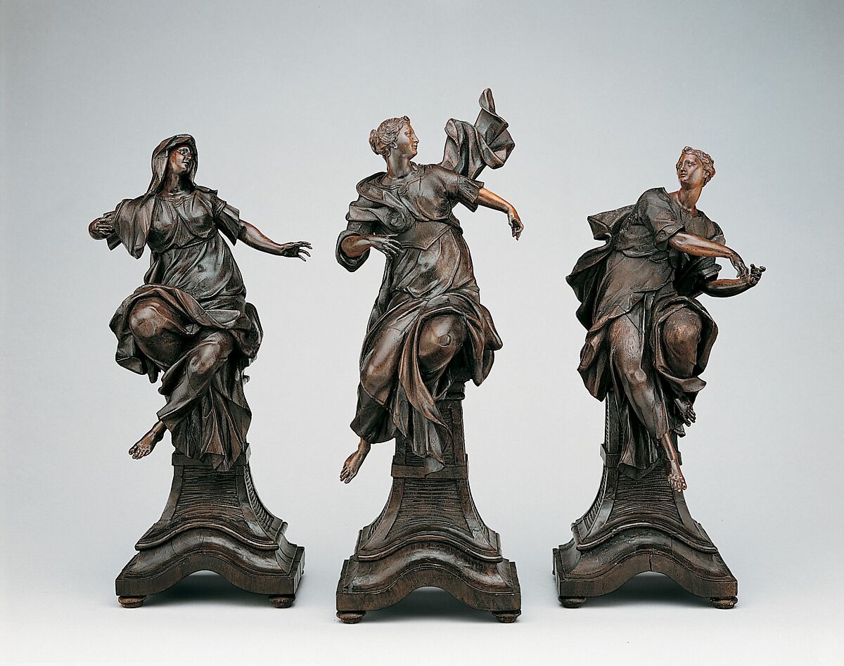 Moll's reputation as a major Austrian sculptor rests mainly on state tombs for the Habsburgs located in the Capuchin church in Vienna. These include one of the most splendid examples of late Baroque sculpture, the double sarcophagus made in 1753–54 for Empress Maria Theresa (d. 1780) and her consort, Francis I of Lorraine (d. 1765). The sculptor's first major project, completed in 1739, was the figurative decoration for the pulpit of the Church of the Servites, Vienna. The Museum's statuettes are small-scale versions of the monumental figures crowning the pulpit: the theological virtues Faith, Love (Charity), and Hope. However, because of the lack of attributes, we can only assume that our figures served as independent works of art rather than as devotional objects. Their style echoes the influence of the Austrian sculptor Georg Raphael Donner (1693–1741). The strongly contrasted forms and the skillfully differentiated finishes of the walnut and dark-stained ivory take advantage of effects of light and shadow and evoke the unifying artificial gallery patina of bronze sculpture of this period. The almost metal-like appearance of the surface tooling demonstrates the artist's virtuosity and may be an early testament to Moll's prominent place in the development of sculptural metal casting in eighteenth-century Vienna.