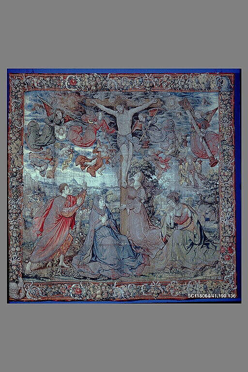 With the crucified Christ anchoring the composition, a host of angels fills a turbulent sky, holding the symbols of the Passion. Below, John the Evangelist strides in from the left; at the right, Mary Magdalene, richly-dressed fitting to the popular perception of her as a reformed courtesan, elegantly crumples forward with hand-wringing grief. Also weeping, the Virgin Mary gazes up at her son, and a third holy woman, possibly Mary of Cleophas, embraces the cross. The painterly detail of the tapestry’s design extends to the minutely observed background landscape, in which the bracketing episodes of the carrying of the cross and the entombment can be glimpsed flanking the central scene. To this the virtuoso tapestry-weavers, clearly at the pinnacle of their profession, have brought a material sumptuousness which would have glimmered in the candlelight and which serve to rank this tapestry amongst the richest survivals of the period.