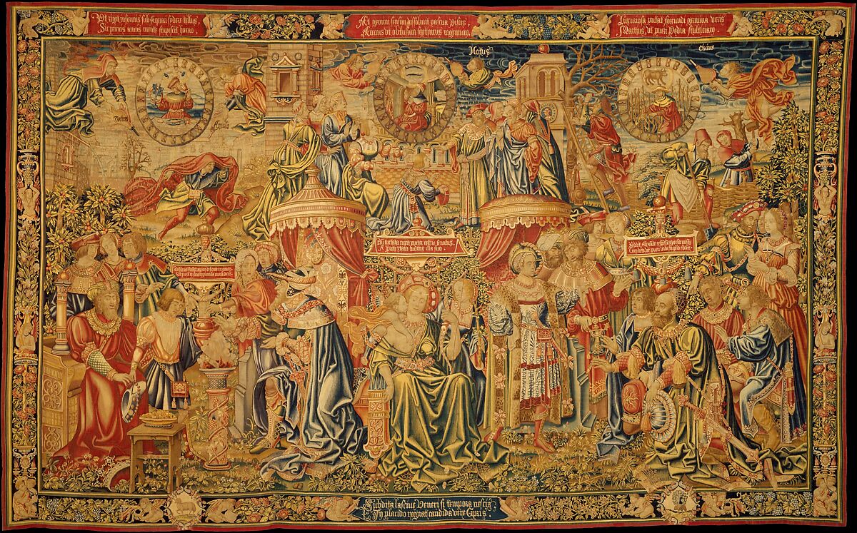 This is the first of a set of four tapestries illustrating the life of a man as divided into twelve periods of six years. Venus, in the center, stands for the springtime of life; the symbols and occupations of three months, January, February, and March, represent the years from birth to eighteen. The stories show Moses, as a child, choosing a burning coal instead of a piece of gold; a Roman boy, Papirius, explaining to the Senators how he had tricked his mother in order to conceal their secrets; and the youthful Alexander astonishing the Persian ambassadors by his shrewdness.