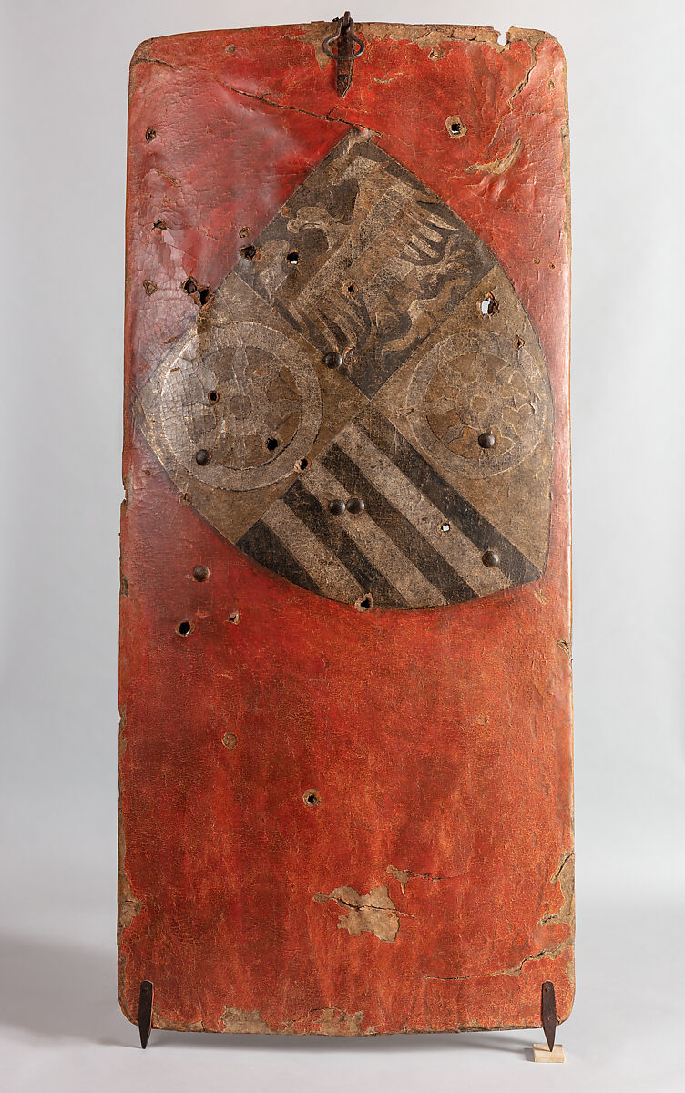 Shields of this exceptionally large size and weight (50 lb. [23 kg]) were propped on the ground to form a wall that protected archers and infantrymen. This shield comes from the arsenal of the town of Erfurt and is painted with the coat of arms of that city and its dependencies Vieselbach, Kapellendorf, and Vargula. It presumably was made after 1385, when the archbishop of Erfurt acquired suzerainty over the town of Vargula, but before 1387, when the coat of arms was again augmented. The holes in the surface were made by crossbow bolts and by bullets.