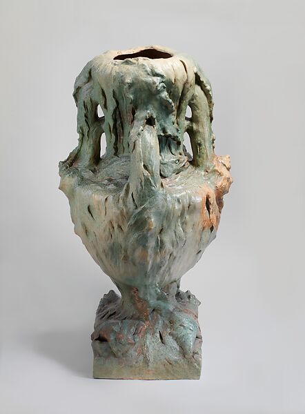 Ce vase, chef-d’œuvre français de l’Art nouveau, est l’une des céramiques les plus ambitieuses de Hoentschel, architecte, ensemblier, collectionneur et céramiste. Des motifs aquatiques — poissons, crustacés, coquillages et algues — sont habilement intégrés à la forme, et la glaçure marbrée vient appuyer le thème marin. Ce vase et l’autre avec lequel il formait une paire occupèrent une place de choix à l’Exposition universelle de 1900, à Paris.