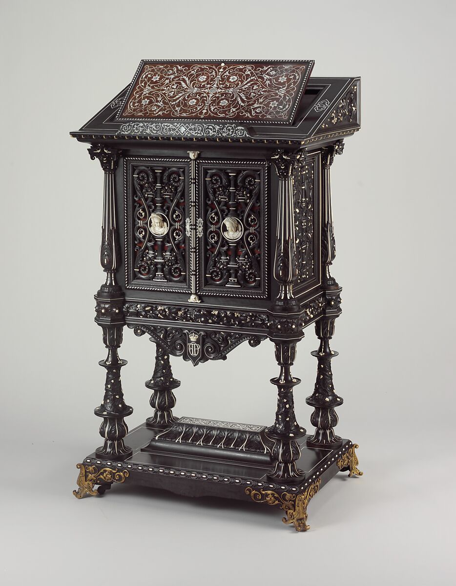 The shaped aprons on the front and back of this bookstand bear the crowned initials FPO for Ferdinand Philippe, duc d'Orléans (1810—1842), oldest son of King Louis-Philippe. A noted patron of the arts with eclectic taste, the duke commissioned this striking black and white showpiece from the ébéniste Georges-Alphonse Jacob Desmalter, grandson of the celebrated eighteenth-century menuisier (joiner) Georges Jacob, in 1839. Most likely intended to display Les Offices de la Vierge, a lavish book of hours created for Ferdinand Philippe the previous year, the bookstand consists of a base, a bookcase with two openwork doors supported on baluster-shaped legs, and a sloping upper part with a book rest. A detailed mémoire by Desmalter indicates that the velvet-lined interior originally held a pillow for the missal. The top has a ratcheted mechanism that allows the central panel, embellished with marquetry of ivory, mother-of-pearl, and snakewood, to be raised. The historicizing design by Charles-Auguste Questel reflected contemporary interest in the Renaissance style. The sculptor Chabraux carved the elaborate decoration in ivory and ebonized maple.