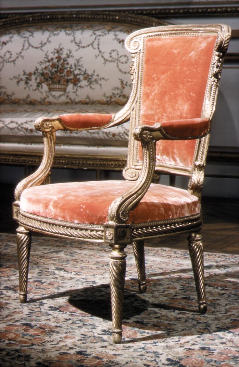 Part of a larger set of seat furniture, these elegant armchairs with a concave back, are so-called fauteuils en cabriolet. Their frames are stamped on the underside I-B, which is believed to be an alternate mark for Georges Jacob (master 1765–1814), one of the most successful chair makers of eighteenth-century France, who supplied beds and seat furniture to the crown.
