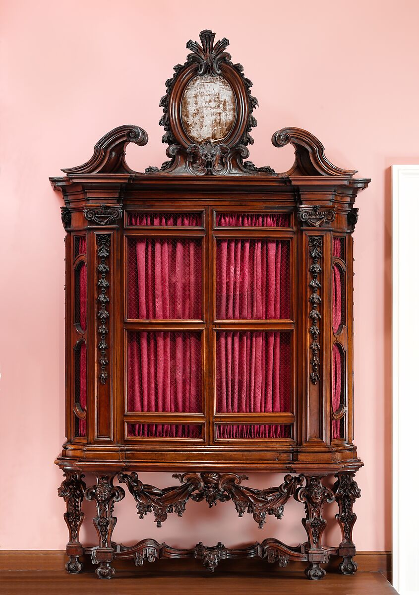 - Medium: Walnut and poplar; iron hinges and locks, metal wire; antique silk and linen brocatelle door curtains (not original)