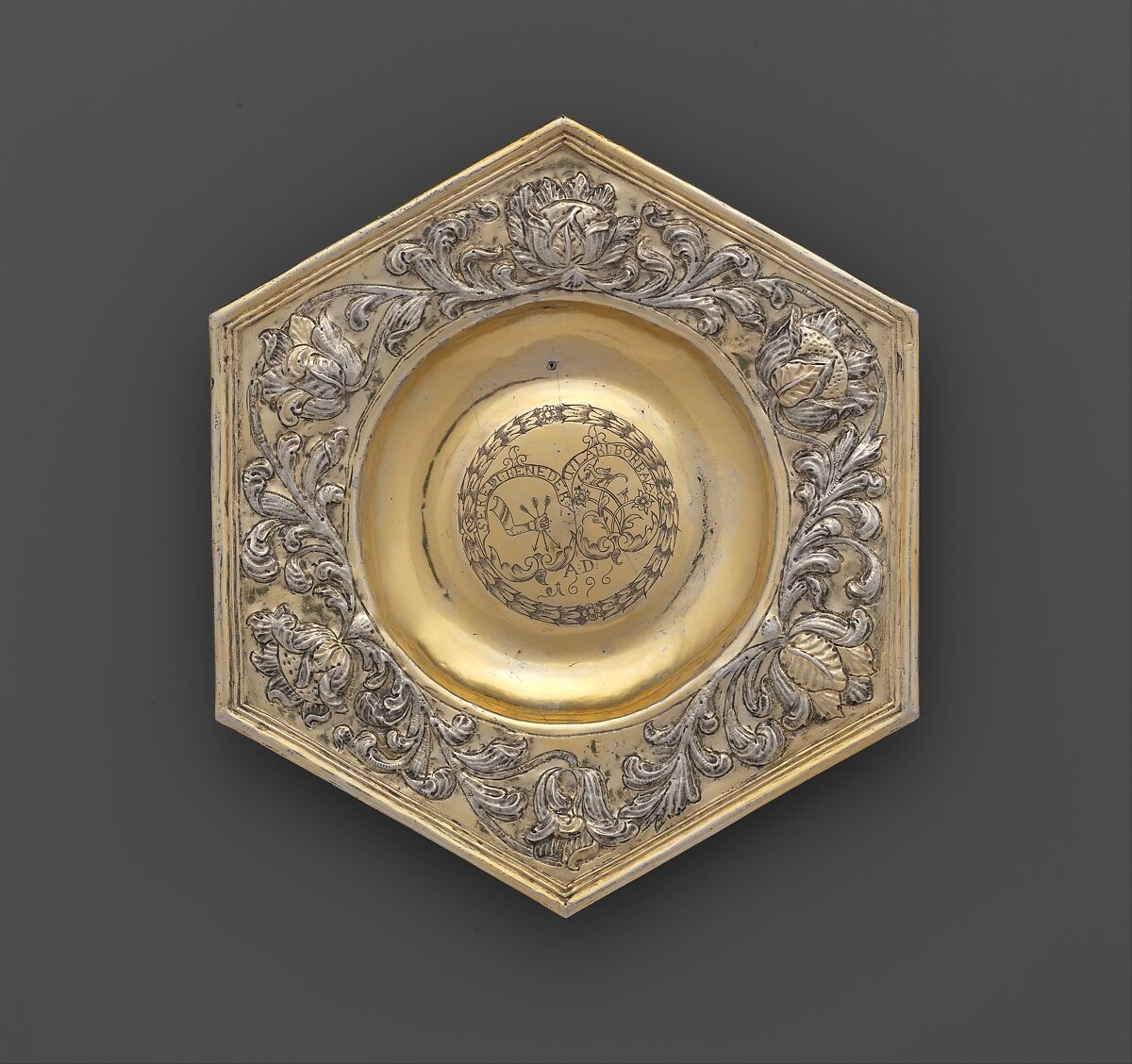 The center of each dish in this set (acc. nos. 2010.110.42–49) bears an engraved laurel wreath encircling a coat of arms. Small differences in these arms could be the result of different masters working quickly to complete what was probably a much larger set for a wedding that was fast approaching. The bold blossoms in the six corners symbolize both the wish for abundance throughout marriage and the transitory glories of earthly existence. Salgo acquired two of these dishes at a later date from the others, but all eight pieces belonged to the same set of fourteen dishes that were once part of the Andrássy treasury.