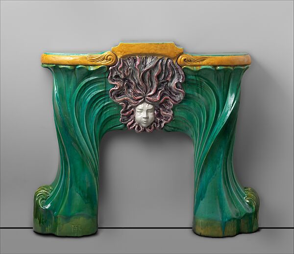 This fireplace is made of stoneware, a dense ceramic body that is highly durable. Its strong, sculptural design reflects the popularity of the Art Nouveau style in the years around 1900 when the fireplace was produced. The twisting forms of the vertical sides and the complex, curving shapes of the hair above the mask are characteristic of Art Nouveau design, which emphasized stylized, sinuous lines and commonly employed motifs from the natural world.