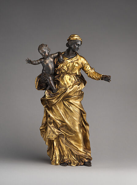 This work of art is currently on loan to the museum.Algardi excelled in designing small-scale sculpture to be cast in metal. The delicate features of the Virgin and the Child, the careful arrangement of the cloak and the gracefully balanced composition are hallmarks of the artist. The model is known in several bronze versions, but this is the only one to have been silvered and gilt. The Virgin's face, hands and feet, and the Christ Child have been separately cast, sivered (now tarnished) and then attached to the Virgin's body. The cloak is textured with tiny marks made by punching the surface. Algardi's model was widely successful and repeated in other media.