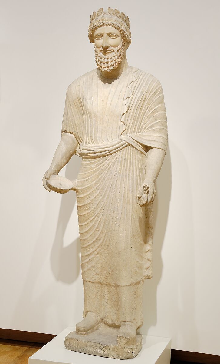 This over-lifesize figure depicts a bearded man making an offering. He wears an ornate wreath of ivy leaves, flowers, and laurel sprays, and holds a libation bowl (phiale) in his right hand and a box and a small branch in his left. He wears a chiton and has a himation draped over his left shoulder—attire that in classical Greece would have been more appropriate for a woman, since men were usually represented in heroic or athletic nudity. The right forearm of the statue is modern.
