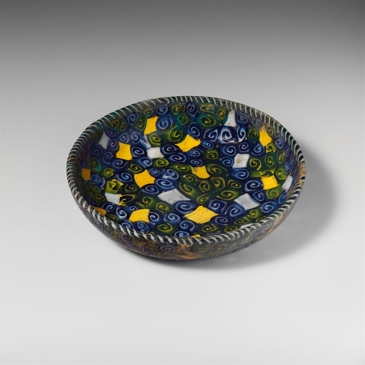 This bowl is highly decorative, with spiral designs and contrasting patches of translucent and opaque glass. It imitates an even more luxurious type of tableware, for the prominent squares of yellow glass act as substitutes for sections of gold glass.