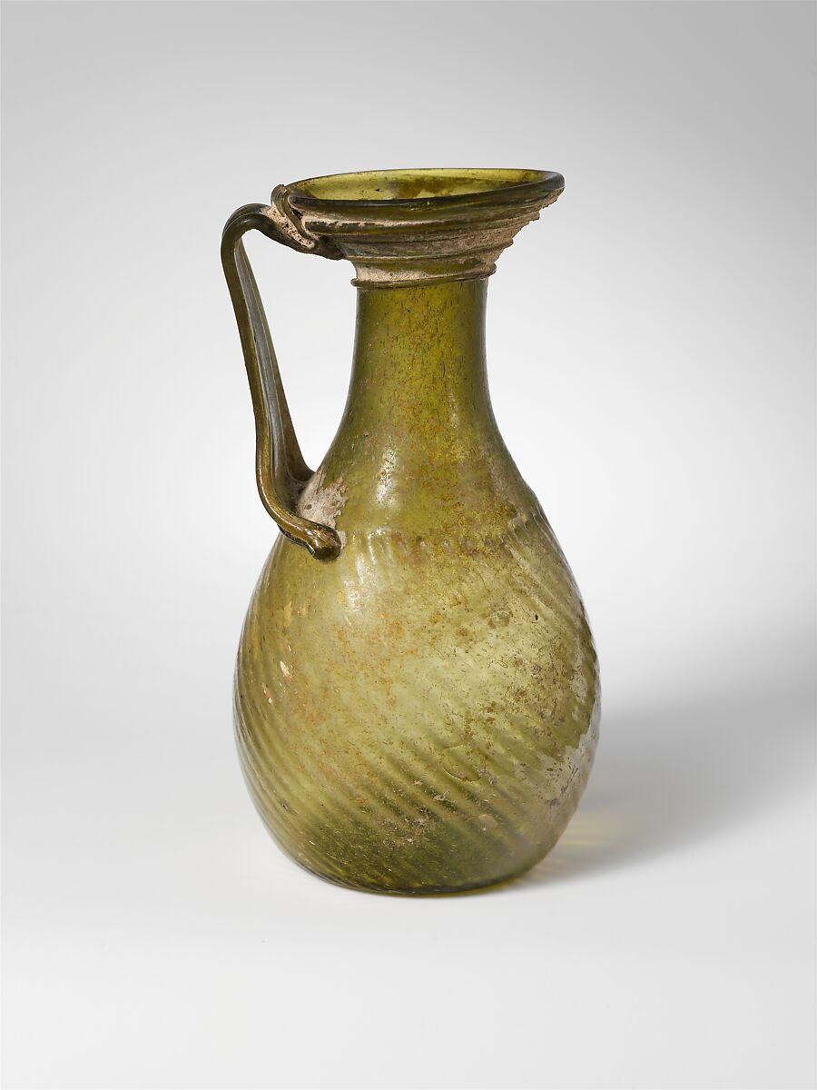 Rounded rim with slight inward fold on one side; broad, flaring mouth; cylindrical neck expanding downwards to join bulbous body; kick in bottom with pontil mark; broad, three-ribbed strap handle attached to top of body, drawn up and slightly outwards, then turned in at acute angle, and trailed onto underside of mouth, ending in jagged edge slightly above rim.