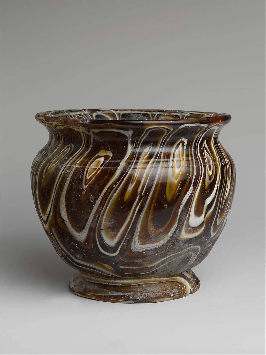 Although fragments of mosaic glass are quite numerous and widespread, relatively few intact vessels are known. This jar is one of the star pieces to have survived and is a tour-de-force of the Hellenistic glassworker's skill. Made in imitation of vessels carved in semiprecious stone, such as onyx and banded agate, it gives an idea of the opulent tastes of the age.