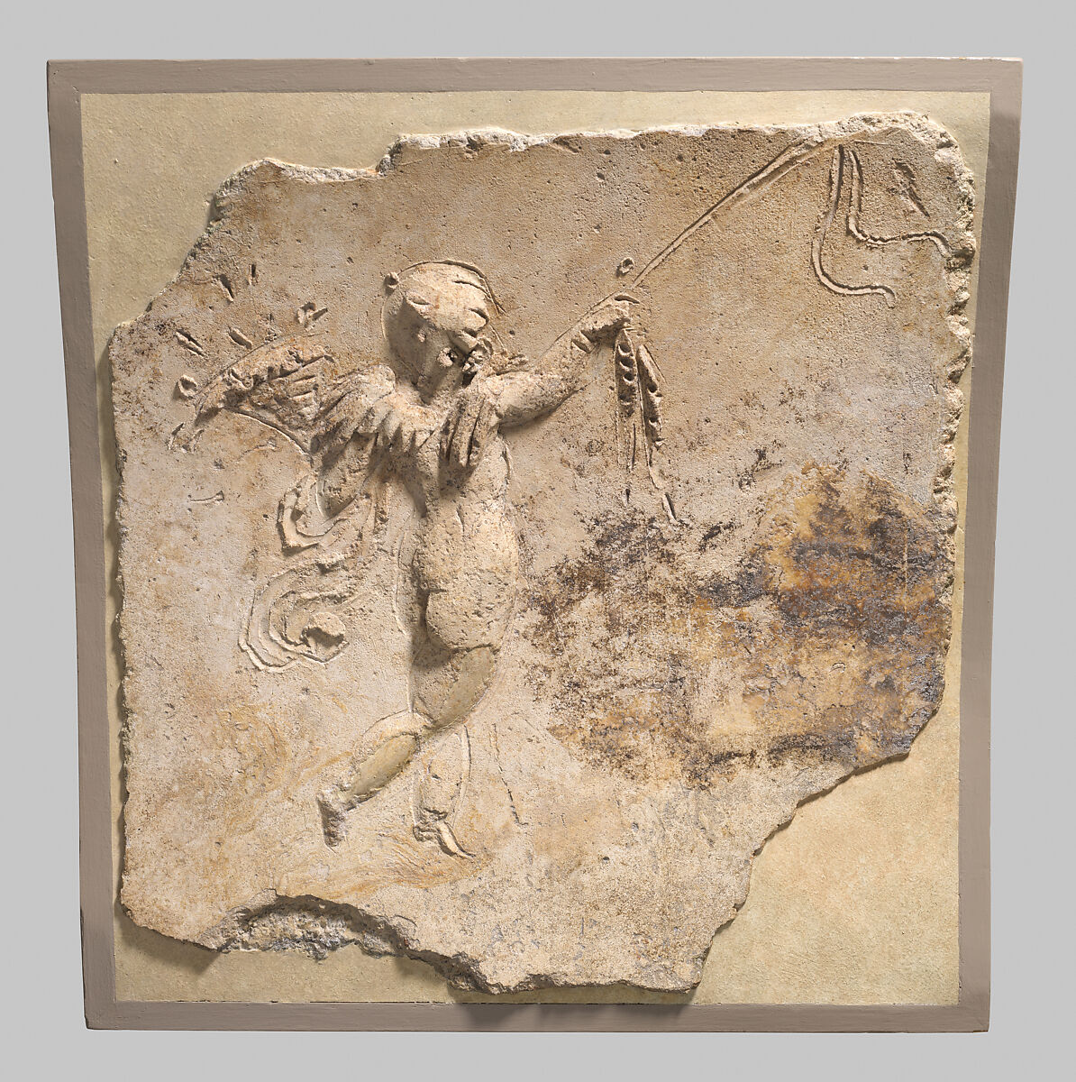 Stucco played an important role in Roman construction and interior design. In its simplest form, it provided an attractive smooth surface for walls and columns built of rough masonry and brick. Since stucco was applied wet, its surface could also be shaped with either a template or a mold to provide a decorative architectural framework for wall frescoes. Stucco was also extensively employed to cover ceilings, especially barrel vaults in the halls, corridors, and rooms of large houses, in public buildings such as baths, and in tombs. These ceilings could be extremely elaborate, including panels with figures modeled freehand in situ. The eight ceiling panels displayed here belong to this last category. Their subjects are typical of the genre; they include satyrs, maenads, cupids, and panthers. Other mythological figures and creatures were also popular. Occasionally, too, the stucco was painted so that the pale relief decoration stood out more prominently against a deeply colored background.