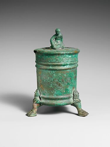 The engraved frieze on the cylindrical container depicts a battle between Greeks and Amazons. The solid-cast feet are shaped like lion's paws but terminate in attachments depicting winged sirens. The engravings of two nude warriors on the lid, one standing and one seated, are modern additions, no doubt inspired by similar compositions frequently seen on mirrors. The cista handle is missing.