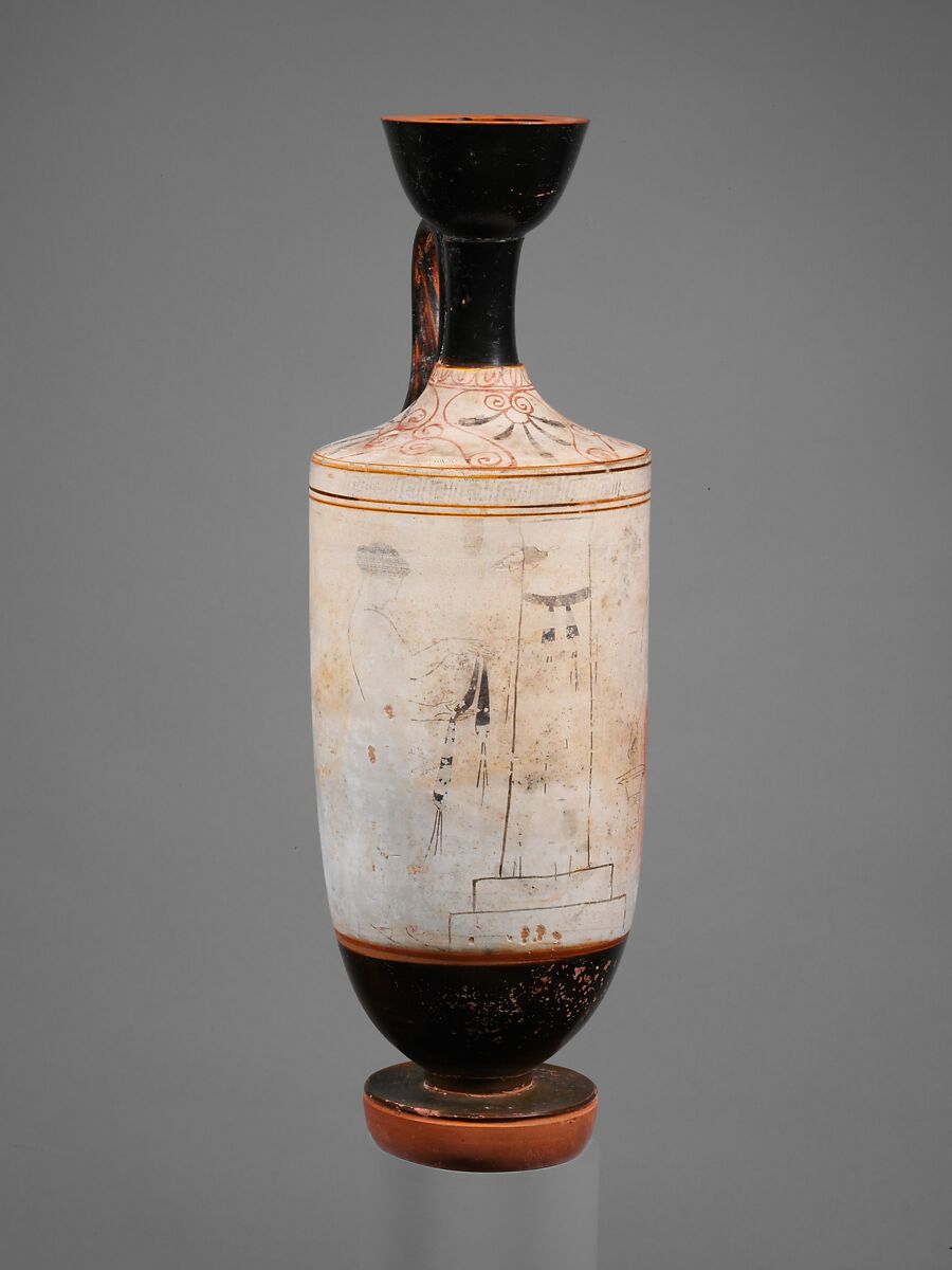 Although tomb scenes do not usually depict activity, it appears that the woman at the left is about to tie another fillet around the shaft of the monument. The figure on the right holds a situla (bucket) and an alabastron (perfume vase). Representations such as this one are invaluable for showing how specific shapes were used. The situla is quite rare under all circumstances.